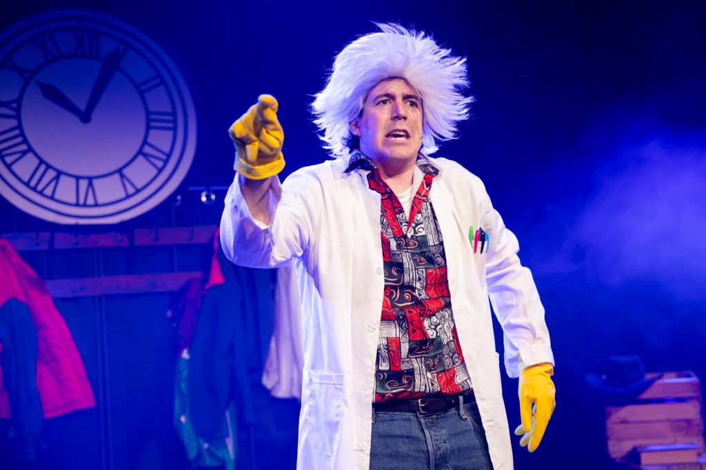 Before anything really gets going, you’re already clocking the details – the hoverboard, the cap, the Hill Valley bits dotted around, the Enchantment Under the Sea school dance sign… it’s the kind of setup where you end up scanning the stage trying to find what else has been hidden in here. And that’s a great way in, because it immediately tells you Biff to the Future isn’t just throwing a few references around and hoping for the best, and that someone’s actually thought about it.